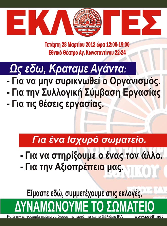 Μετά και την απόφαση της Γ.Σ. που έγινε την 21-3-2012 , και την εκλογή της Εφορευτικής Επιτροπής ( παρουσία Δικαστικής Αντιπροσώπου , Πρωτοδίκου ) , οι εκλογές του Σωματείου μας θα γίνουν στις 28-3-2012 ημέρα Τετάρτη , στο “ ΕΘΝΙΚΟ ΘΕΑΤΡΟ ” και στο Γραφείο του ΣΕΕΘ .