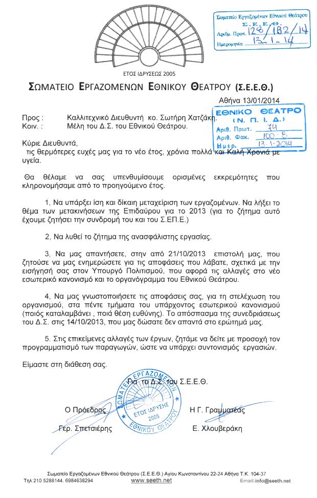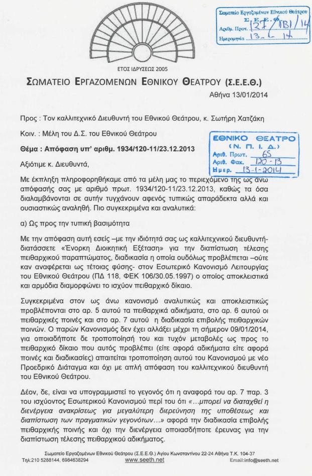 Ενέργειες :: Επιστολή του Σωματείου σχετικά με την απόφαση υπ’ αριθμ. 1934/120-11/23.12.2013 και εκκρεμότητες από το 2013 |