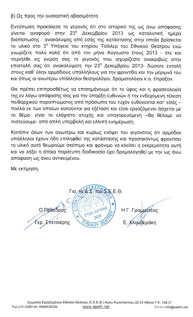 Επιστολή του Σωματείου σχετικά με την απόφαση υπ’ αριθμ. 1934/120-11/23.12.2013 και εκκρεμότητες από το 2013