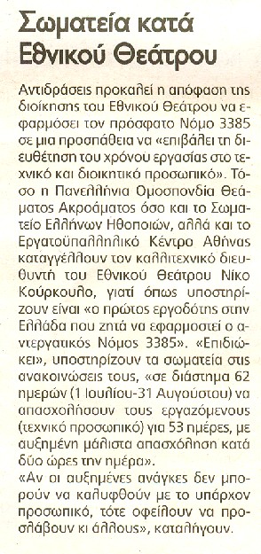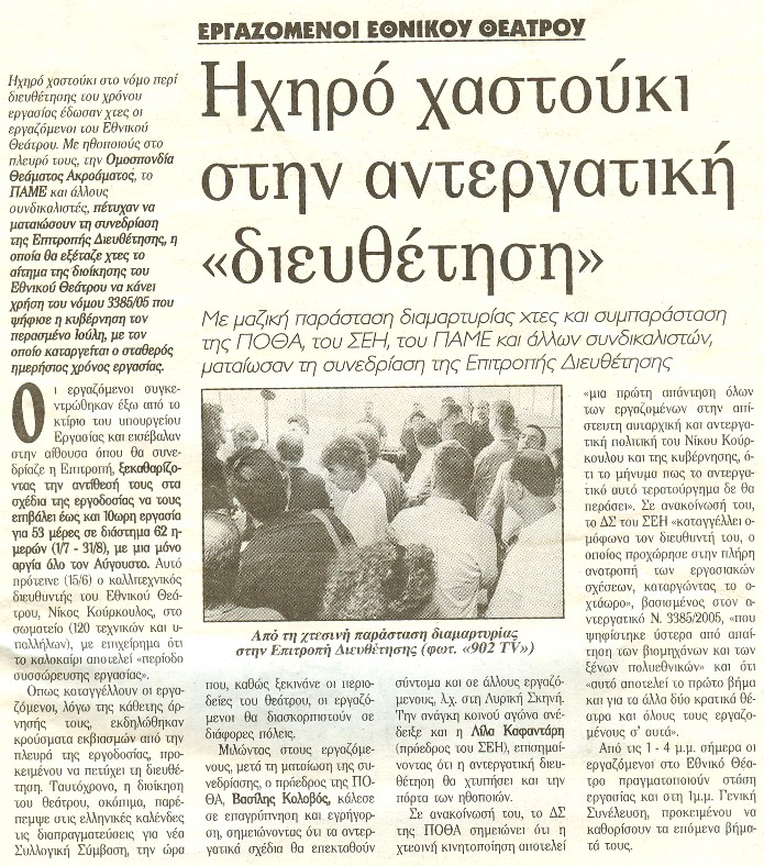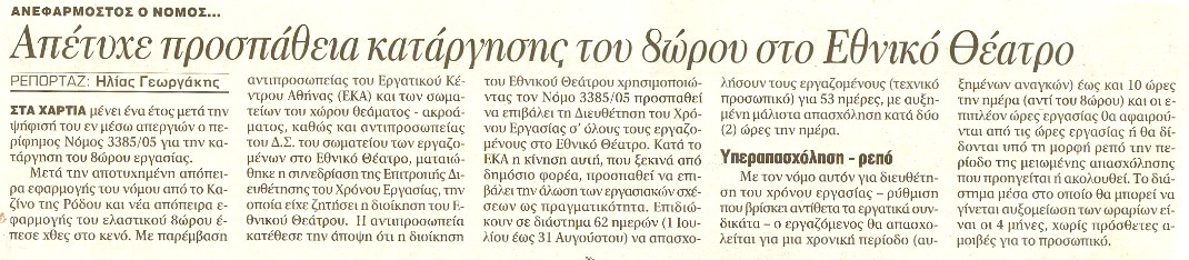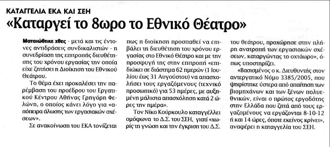 Για πρώτη φορά από τότε που ψηφίσθηκε ο νόμος 3385 (Αύγουστος του 2005) θα κληθεί η επιτροπή διευθέτησης χρόνου εργασίας να συνεδριάσει μετά από αίτηση του Εθνικού Θεάτρου. Με αίτημα την καταστρατήγηση του 8ώρου, την εφαρμογή, δηλαδή, του ελαστικού ωραρίου και, συνεπώς, τη δημιουργία "εργαζομένων -λάστιχο". Η διευθέτηση του χρόνου εργασίας οδηγεί στην πλήρη ανατροπή των εργασιακών σχέσεων, στην ωρομίσθια εργασία ("σήμερα σε χρειάζομαι 12 ώρες, αύριο σε χρειάζομαι 3 ώρες").