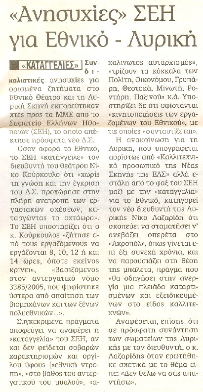 - Εναρμόνιση των αποδοχών με την Συλλογική Σύμβαση εργασίας ΝΠΙΔ (δέσμευση του Καλλιτεχνικού Διευθυντή Ενώπιον του Δ.Σ. του Εθνικού Θεάτρου στης 03/04/06).