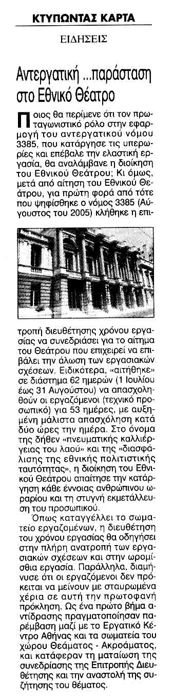 Οι εργαζόμενοι του Εθνικού Θεάτρου δεν πρόκειται να μείνουν με σταυρωμένα χέρια σ’ αυτή την πρωτοφανή πρόκληση. Μη έχοντας άλλο μέσο στη διάθεση μας, κηρύσσουμε, με ομόφωνη απόφαση του Δ.Σ. του σωματείου μας, δυο 3ωρες στάσεις εργασίας για την Πέμπτη 22/06/2006.