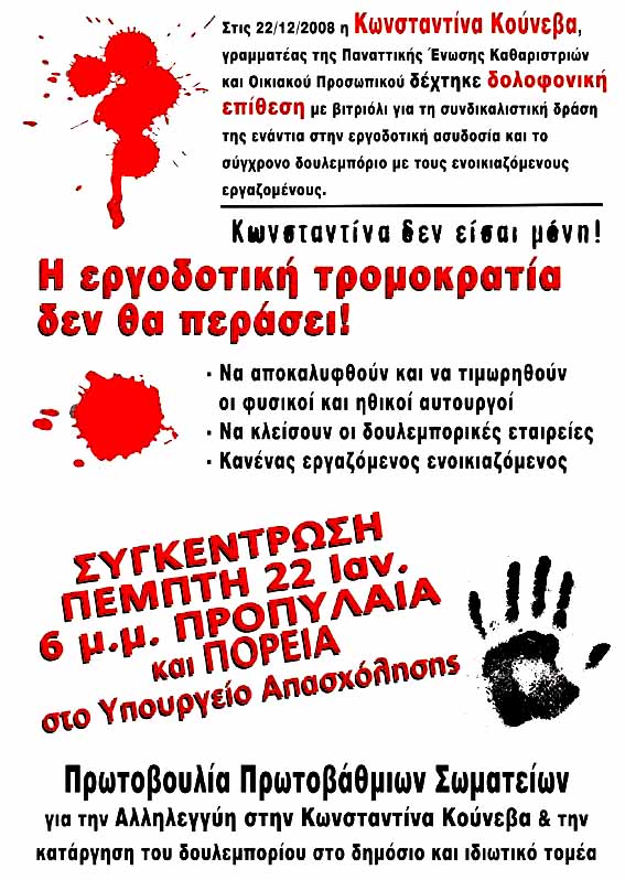 Η δραστήρια γραμματέας του Παναττικού Σωματείου Καθαριστριών (ΠΕΚΟΠ) γίνεται και από τη κλίνη του νοσοκομείου επικίνδυνα «ενοχλητική» για τους φυσικούς και τους ηθικούς αυτουργούς της άνανδρης επίθεσης, ακόμη κι όταν δεν μπορεί να μιλήσει. Ομως, οι περισσότερες γυναίκες που εκπροσωπούσε, ως γραμματέας του σωματείου καθαριστών, σιωπούν, ενώ άλλες, όταν αποφασίζουν να μιλήσουν, κρατούν την ανωνυμία τους. Φοβούνται. Τώρα, ακόμη περισσότερο. Οι μαρτυρίες τους στην έρευνα που πραγματοποίησε ομάδα συνεργατών του ΙΝΕ (Ινστιτούτου Εργασίας) ΓΣΕΕ - ΑΔΕΔΥ, με επικεφαλής τον αναπληρωτή καθηγητή του Παντείου, κ. Γ. Κουζή, με τη συμβολή και της Κούνεβα που συγκέντρωνε στοιχεία για τους εργολάβους των συνεργείων καθαριότητας, απλώς επιβεβαιώνουν την «ευρηματικότητα» των μεθόδων που χρησιμοποιούνται για να αναπτυχθεί στην Ελλάδα ένα ιδιότυπο, τριτοκοσμικό μοντέλο εργασιακών σχέσεων στον συγκεκριμένο τομέα.