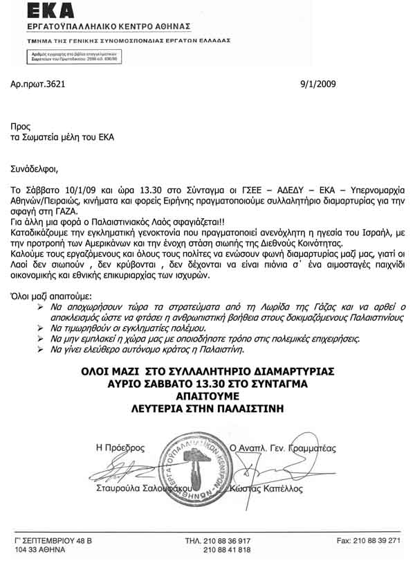 2ο Να γίνει πορεία διαμαρτυρίας στην Ισραηλινή Πρεσβεία όλων των καλλιτεχνών την Τρίτη 20 Ιανουαρίου 2009 και ώρα 2 το μεσημέρι. Η συγκέντρωση θα γίνει στη Στάση του ΜΕΤΡΟ του Μεγάρου Μουσικής (Έξοδος Πάρκο Ελευθερίας).