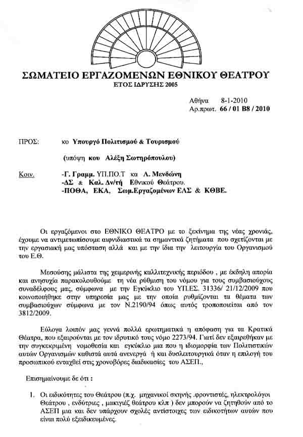 Ενέργειες :: Επιστολή σχετικά με το νόμο 3812/2009